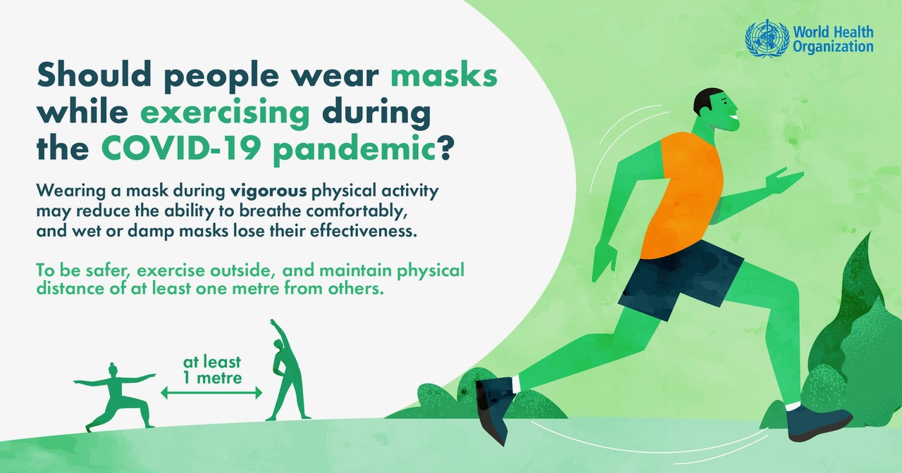 Even when you’re in an area with active COVID-19 transmission, masks should not be worn during vigorous physical activity because of the risk of reducing your breathing capacity. No matter how intensely you exercise, keep at least 1 metre away from others, and if you’re indoors, make sure there is adequate ventilation.