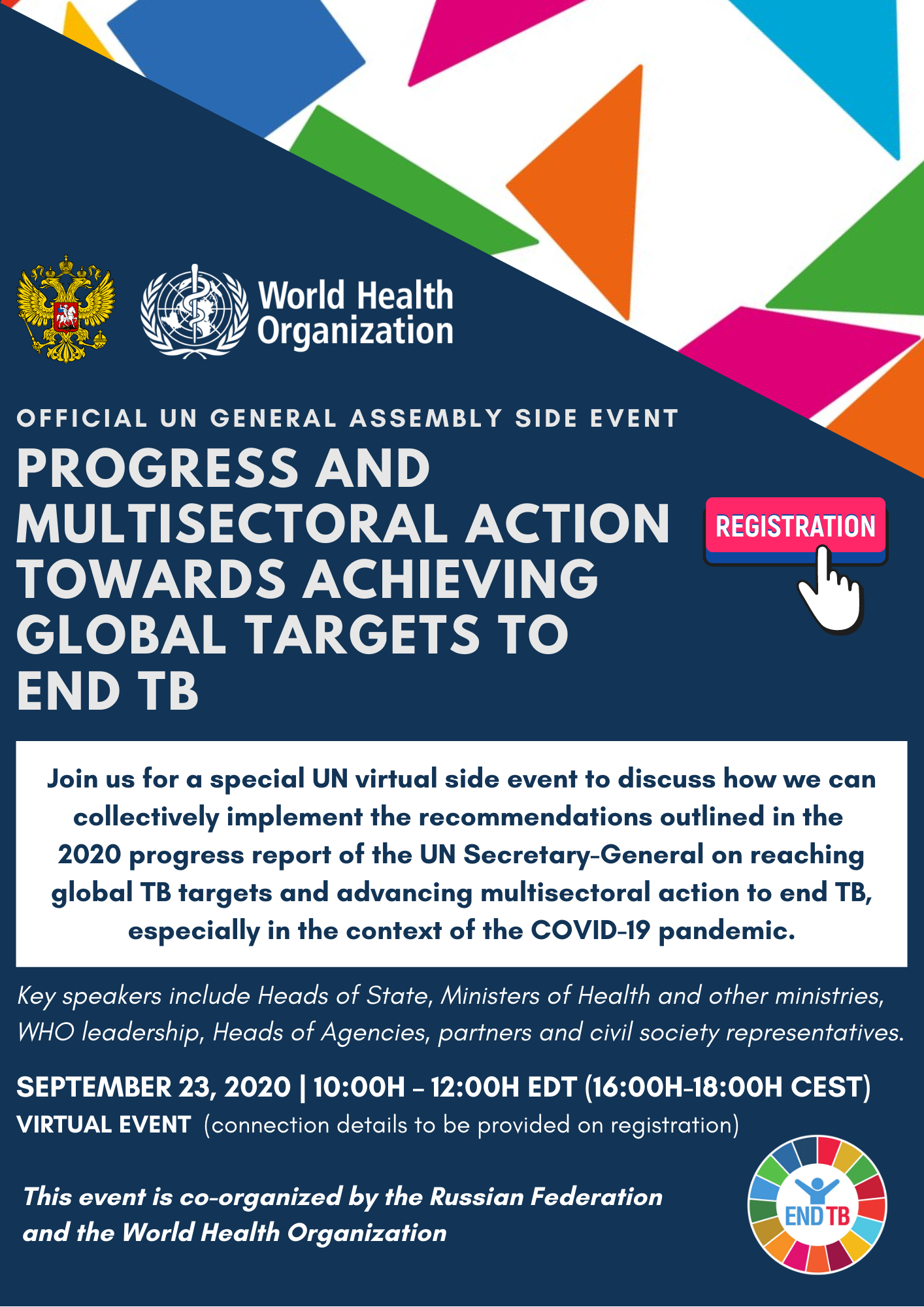 The World Health Organization (WHO) and the Russian Federation are organizing an official UN General Assembly virtual side-event: PROGRESS AND MULTISECTORAL ACTION TOWARDS ACHIEVING GLOBAL TARGETS TO END TB on 23 September from 10:00H – 12:00H EDT (16:00H-18:00H CEST).